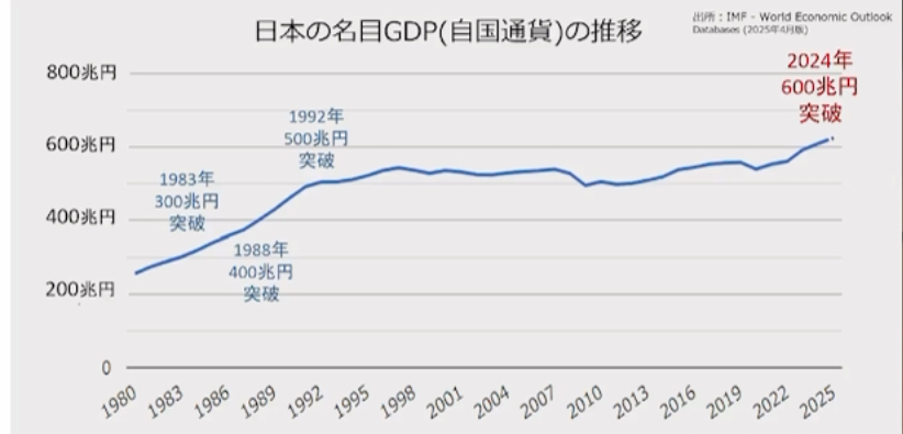 日本は円安とこの物価上昇の後押しもあって、名目GDPは、昨年には600兆円の大台を突破した。この600兆円というのは、2015年、当時、安倍首相が掲げたアベノミクス、新3本の矢の第一の矢として、目標設定をされたものなのである。それからもう10年経っている。300兆円から500兆円までは10年を要していなかったが、600兆円の突破には30年以上の長い年月をかけた。