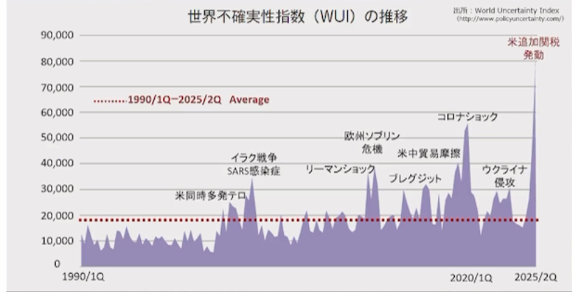 そして、今年、2025年、トランプ2.0で幕を開けた。トランプ関税の発動で、保護主義へと大きく舵を切って、為替変動だとか、WTOの機能不全、そしてG7の影響力の低下、地政学的なリスクというのも招いた結果、世界の不確実性はコロナショックを上回る水準となる。